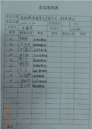 (附图:会议签到表、安全员培训记录表、新材料安全管理规定)